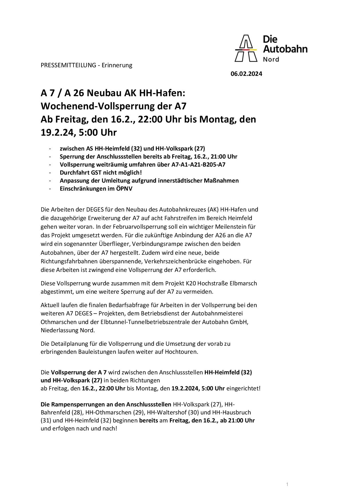 El cierre de rampas en los cruces HH-Volkspark (27), HH-Bahrenfeld (28), HH-Othmarschen (29), HH-Waltershof (30), HH-Waltershof (31) y HH-Heimfeld (32) comenzará el viernes 16 de febrero a partir de las 21:00 horas.