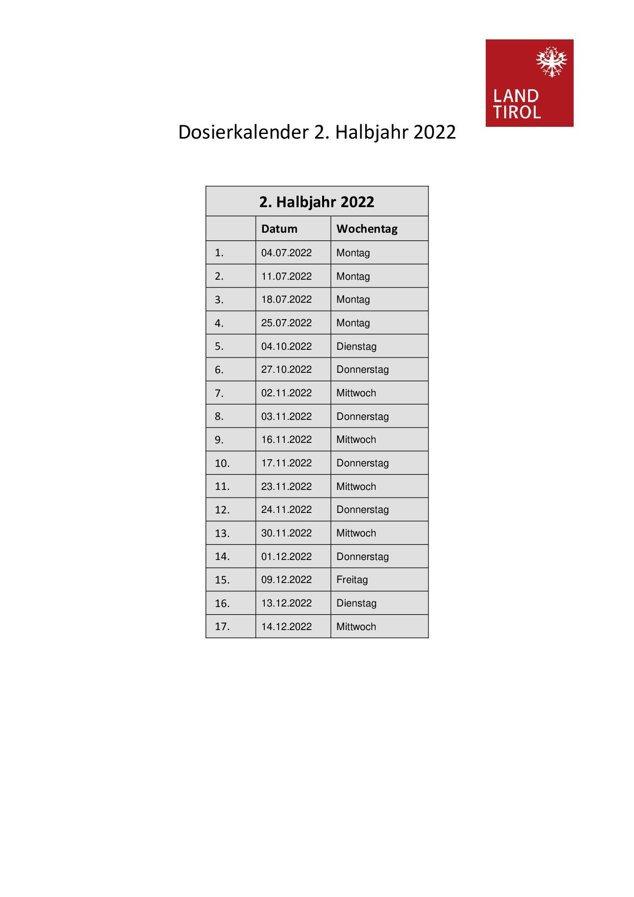 El "Dosierkalender" adjunto ofrece un resumen de las fechas de las medidas del "Blockabfertigung" durante la segunda mitad de 2022 que el gobierno del Tirol implementará.