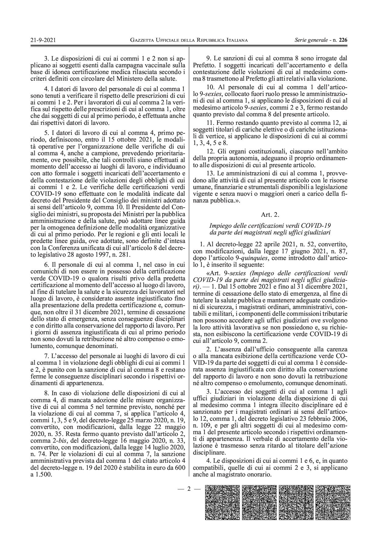 A partir del 15 de octubre de 2021, la disposición introduce la obligación de poseer y exhibir la certificación verde Covid-19 - Green Pass - para acceder a los lugares de trabajo. Esta disposición debe aplicarse desde el 15 de octubre de 2021 hasta el 31 de diciembre de 2021, fecha de terminación del estado de emergencia.