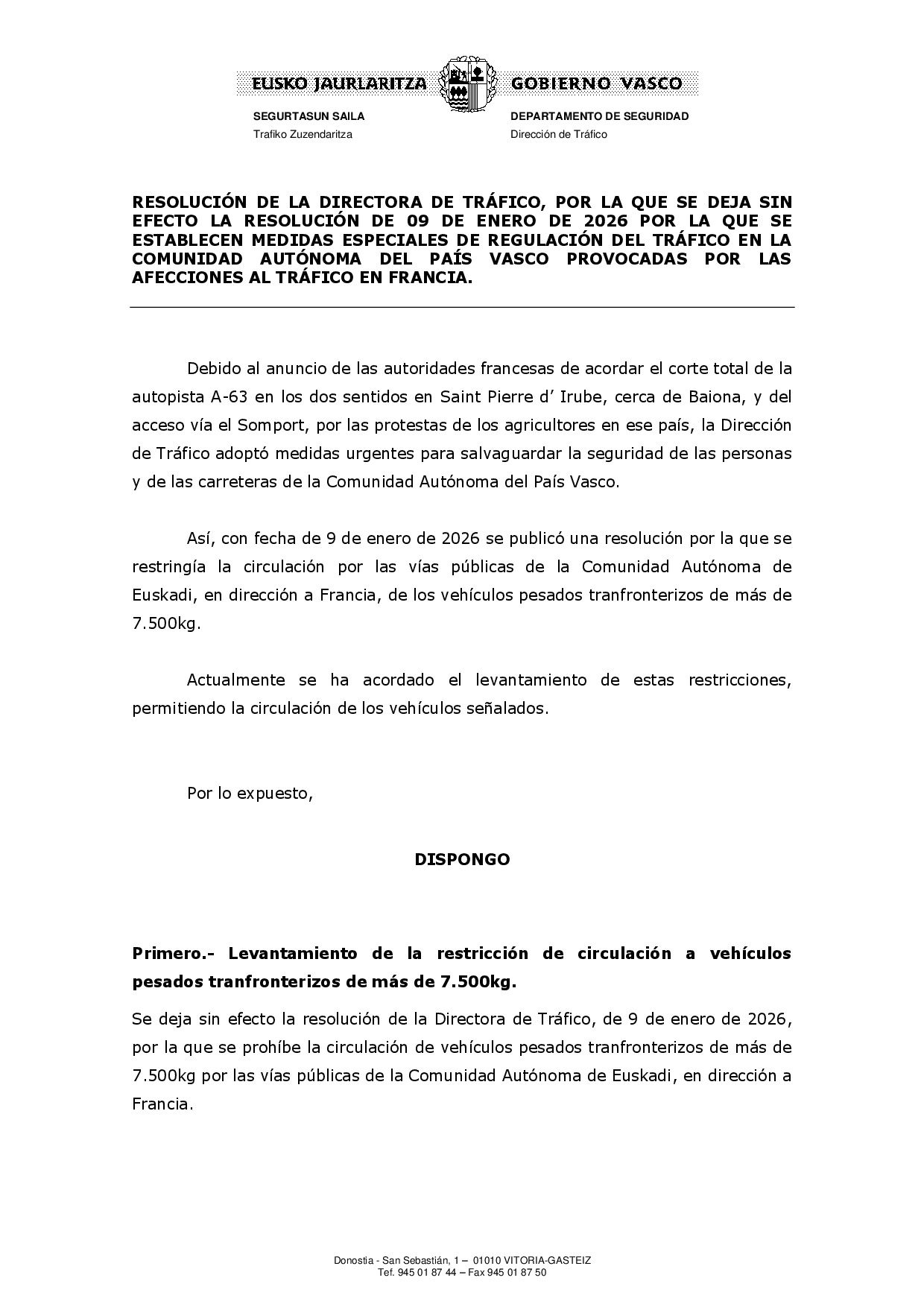 Adjuntamos Resolución de Tráfico del País Vasco por la cual se dejan sin efecto las restricciones a camiones en el País Vasco.