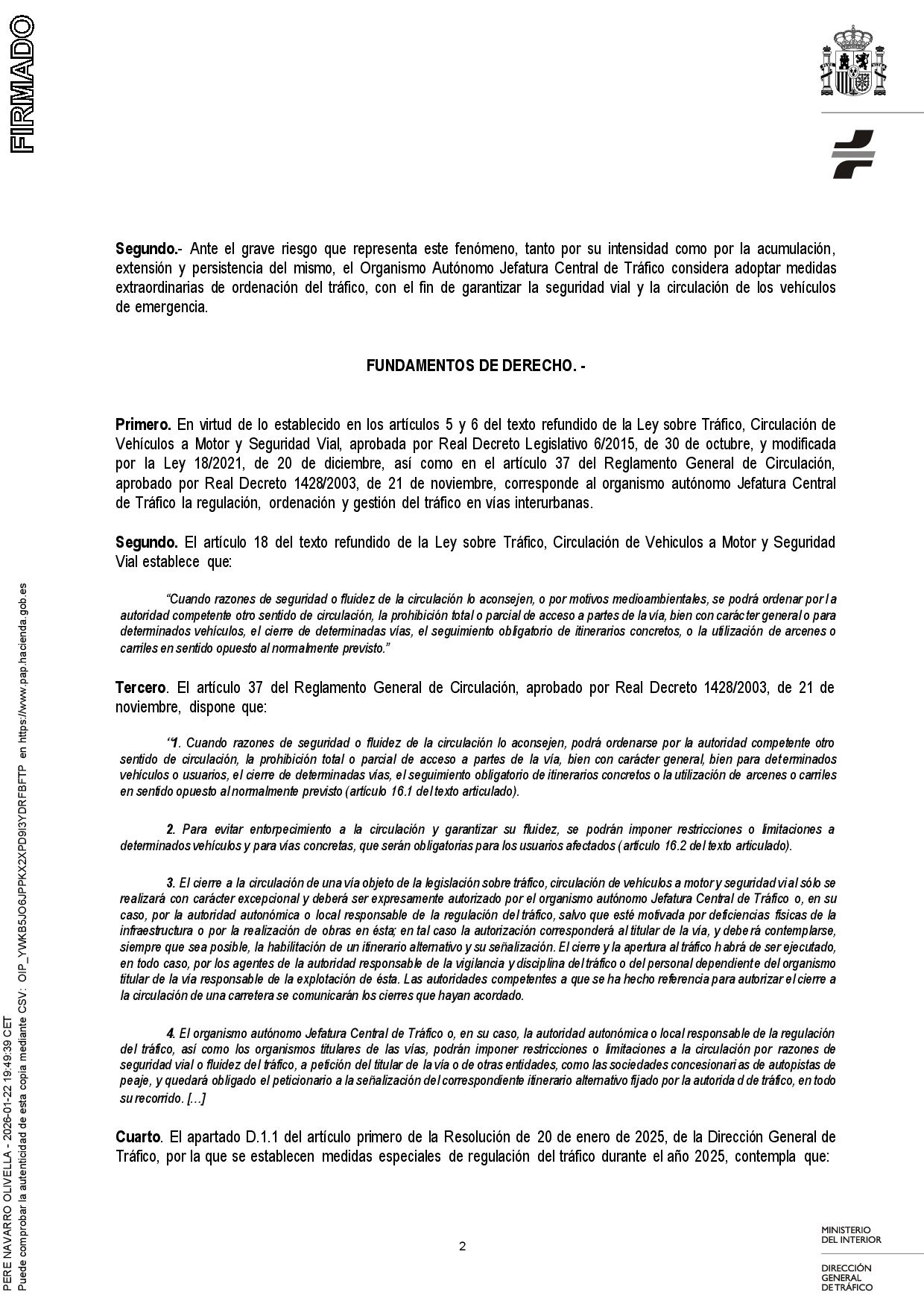Se adjunta resolución sobre la restricción de vehículos pesados por nevadas como consecuencia de la borrasca Ingrid así como nota de prensa al respecto emitida por la Dirección General de Tráfico.