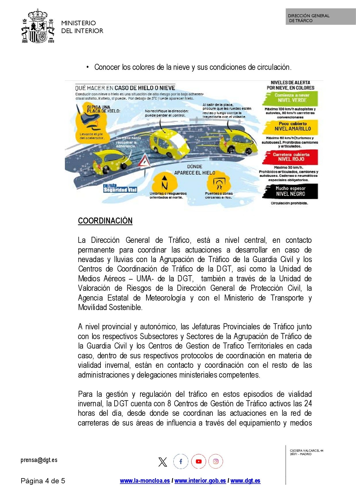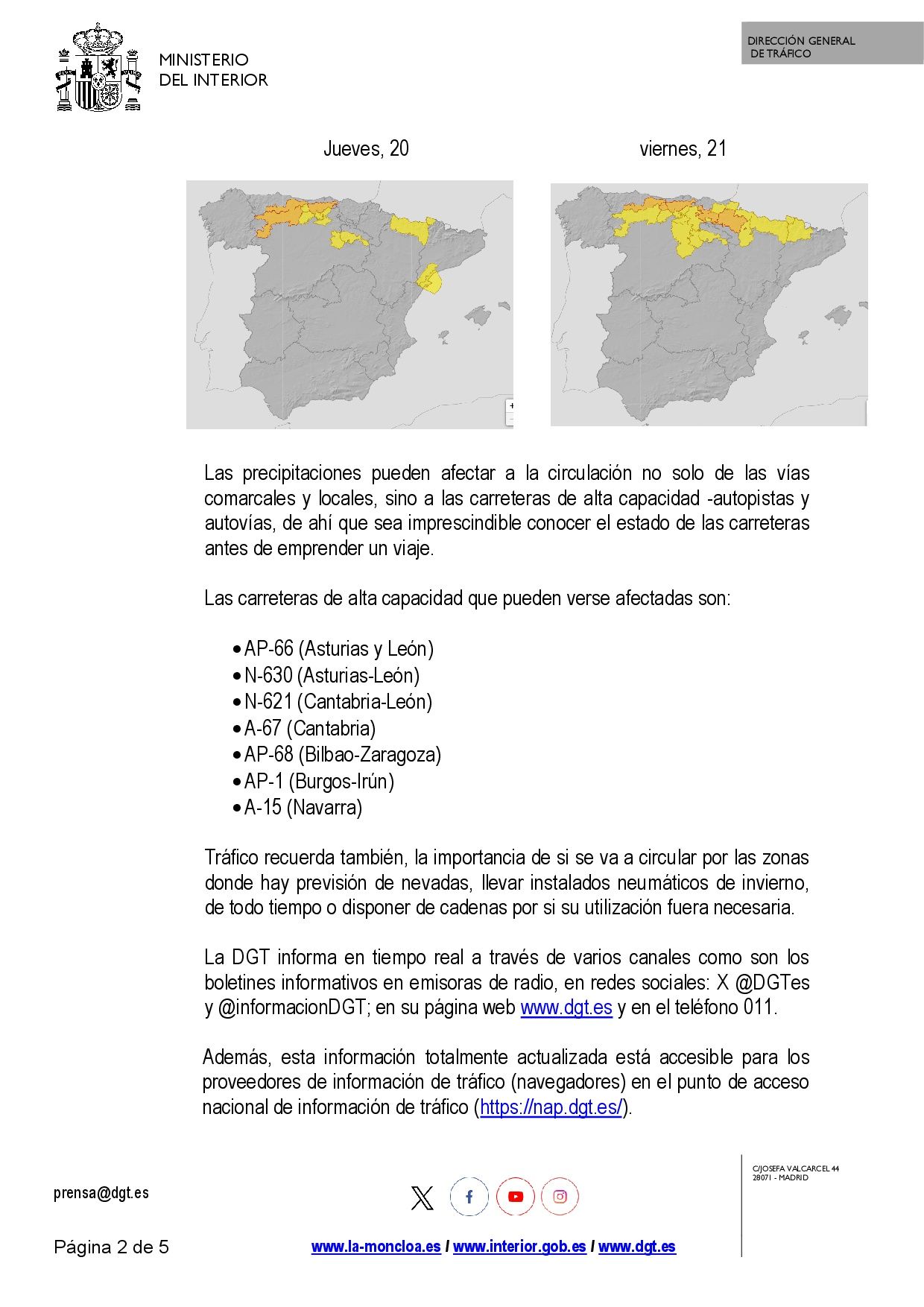 Le hacemos llegar en documento adjunto la nota de prensa emitida hoy por el Ministerio del Interior alertando de caída brusca de temperaturas y posibles nevadas que pueden afectar al tránsito en carreteras.