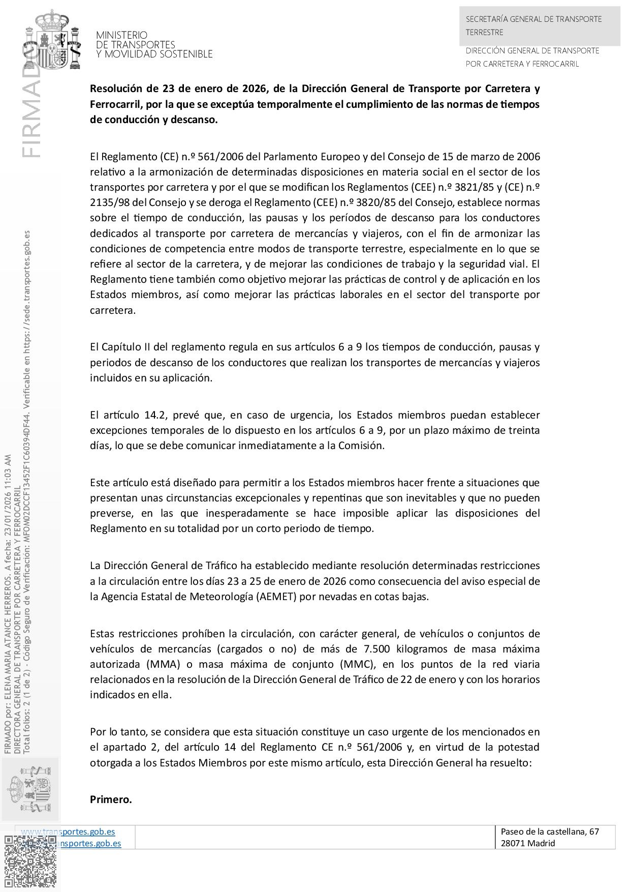 Se adjunta la Resolución de 23 de enero de 2026, de la Dirección General de Transporte por Carretera y Ferrocarril, por la que se exceptúa temporalmente el cumplimiento de las normas de tiempos de conducción y descanso para su conocimiento. Se ha enviado para su publicación en el Boletín Oficial del Estado en los próximos días.