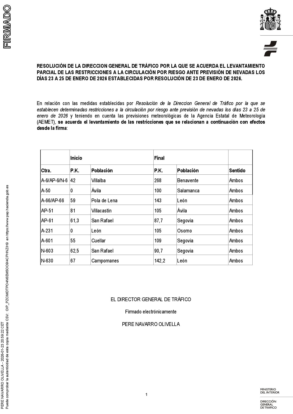 ADJUNTAMOS COPIA DE LA RESOLUCIÓN DE LA DIRECCION GENERAL DE TRÁFICO POR LA QUE SE ACUERDA EL LEVANTAMIENTO PARCIAL DE LAS RESTRICCIONES A LA CIRCULACIÓN POR RIESGO ANTE PREVISIÓN DE NEVADAS LOS DÍAS 23 A 25 DE ENERO DE 2026 ESTABLECIDAS POR RESOLUCIÓN DE 23 DE ENERO DE 2026.